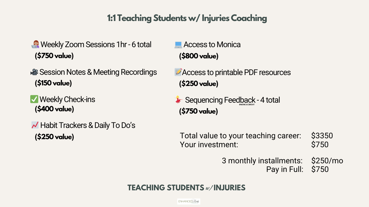 Most trainings teach you what to know about injuries and pain. This mentorship teaches you what to do with it, through a real student from your own teaching life, in a way that transfers to every student you will ever teach.